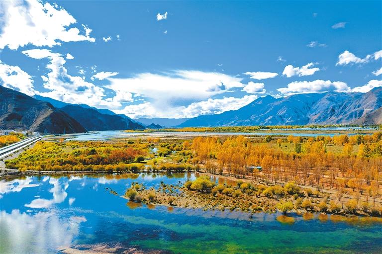達孜區(qū)的秋色不僅僅局限于農(nóng)田,其秋日的河流也別具一番風味。金黃的樹葉飄落在河面上,被河水輕輕托起,河邊的樹木也在清澈的河水中映出倒影,隨著水波蕩漾,一幅流動畫卷舒展開來。