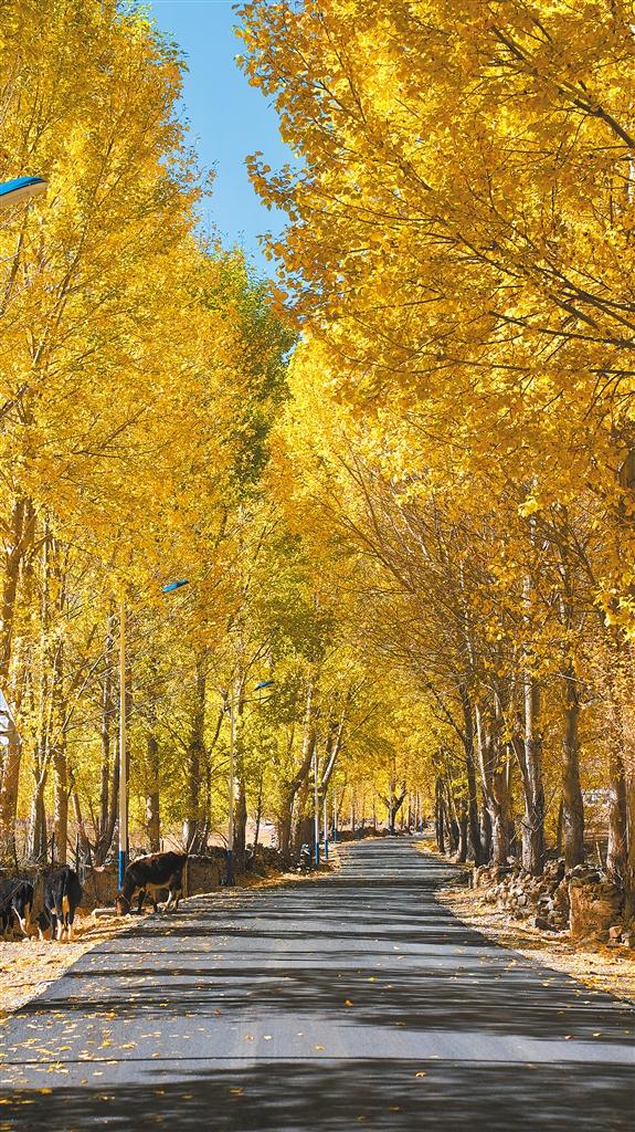 不僅如此,不管是往北通向唐嘎鄉(xiāng)的路,還是往南通向章多鄉(xiāng)的路,或是通往各個村莊的路,都在爭先恐后地訴說著金秋的美麗。道路兩旁聳立著金黃色的楊樹,陽光透過樹葉,散落在道路上,一種靜謐而淡然的美,劃過車窗。