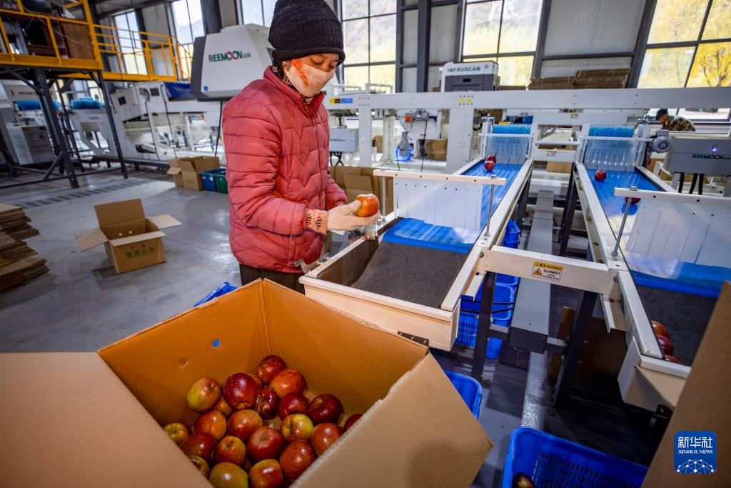 米林市羌納鄉(xiāng)西藏林芝現(xiàn)代蘋(píng)果標(biāo)準(zhǔn)化園區(qū)分揀車間內(nèi),工人在流水線上分揀蘋(píng)果(11月13日攝)。新華社記者 姜帆 攝