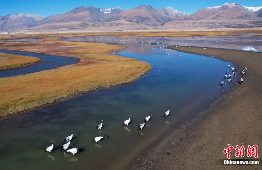 成群的黑頸鶴在西藏拉薩當(dāng)雄縣阿熱濕地覓食。李林 攝