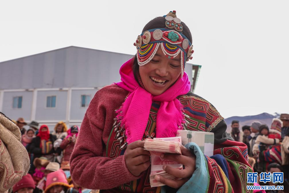 合作社社員領(lǐng)到現(xiàn)金分紅(11月28日攝)。新華社發(fā)(索朗仁青 攝)
