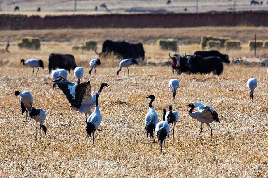 • 西藏日喀則:越冬黑頸鶴成冬日田間美景
