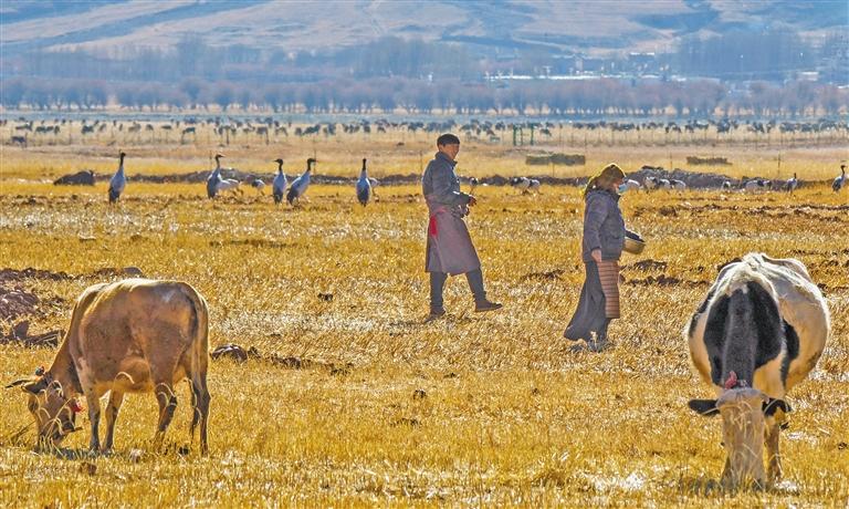 卡孜濕地是其中一個(gè)投食點(diǎn)?,F(xiàn)年43歲的洛桑次旦就住在附近,每天一大早,他都會(huì)到卡孜濕地放牧?!啊従印絹?lái)越多了,十幾年的時(shí)間,黑頸鶴的數(shù)量從幾只增長(zhǎng)到幾百只?!甭迳4蔚└嬖V記者,黑頸鶴和牛各吃各的,互不干擾,非常和諧。
