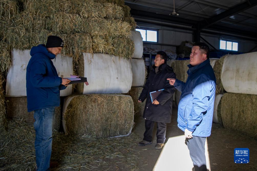 當?shù)馗刹吭诙砭绵l(xiāng)農(nóng)牧業(yè)防抗災物資儲備庫里盤點物資庫存。這里草料、爐子、棉服、煤炭、除雪工具等一應俱全(12月18日攝)。新華社記者 姜帆 攝