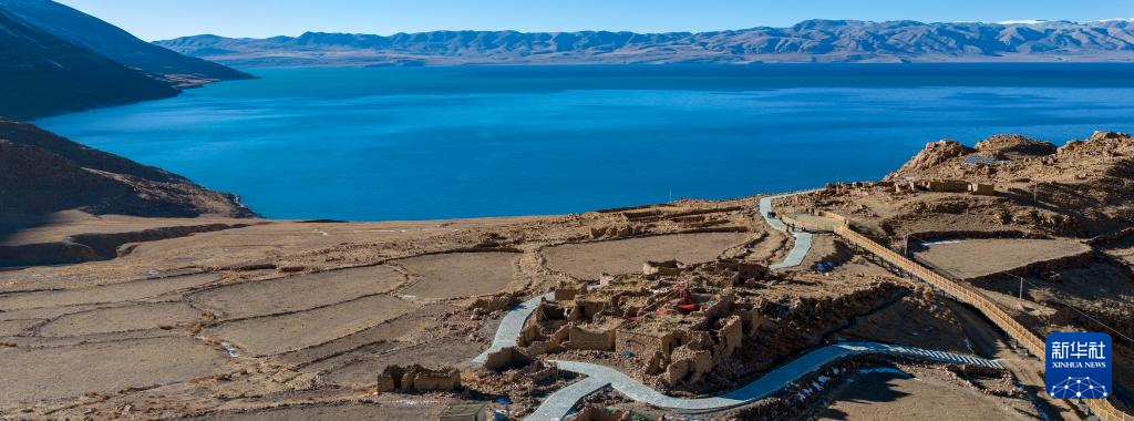 這是當(dāng)惹雍錯(cuò)旁剛剛竣工的棧道和觀景臺(tái)(無(wú)人機(jī)照片,12月20日攝)。新華社記者 格桑朗杰 攝