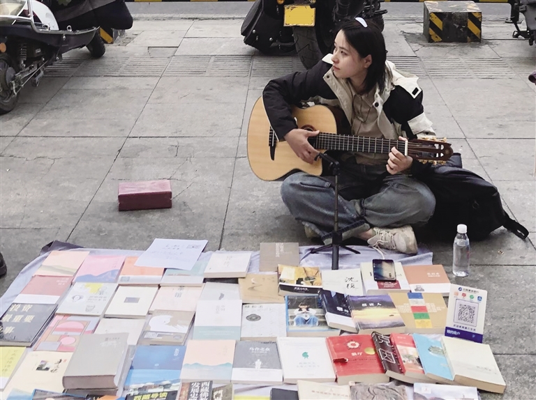 “覺(jué)得熱鬧、好玩,可以調(diào)劑工作生活帶來(lái)的壓力?!狈剿紳嵤菑慕衲?月份開(kāi)始擺攤的,平時(shí)白天上班時(shí),她的活動(dòng)范圍局限于辦公室的“小格子間”;下班后,她便騎著自己的小電動(dòng)車(chē),載著書(shū)籍、地?cái)偛己蛻敉獾剩饘儆谧约旱男?。在自己的攤位上,方思潔把?shū)本整齊地排列在地?cái)偛忌?,擺放好自己的小凳子,精心布置好燈光,便開(kāi)始自己的擺攤生活。