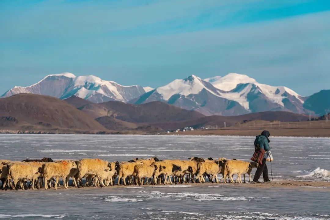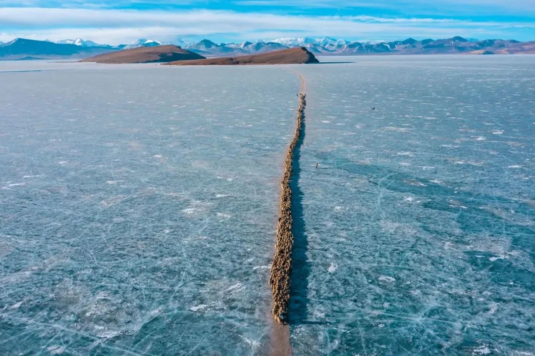 它是世界上海拔最高的村落之一,當?shù)卮迕穸家苑拍翞樯:瑏砼R,岸上的牧場草料已經(jīng)不夠羊群過冬,推瓦村的村民們把羊群集結(jié)在一起,在冰湖上撒牛糞爐灰,畫出一道冰面上的“羊腸小道”把羊群趕上普姆雍錯湖心島上吃草過冬,雖然只有幾公里的距離,但這個傳承千年的畫面卻給人以史詩般的震撼與感動。