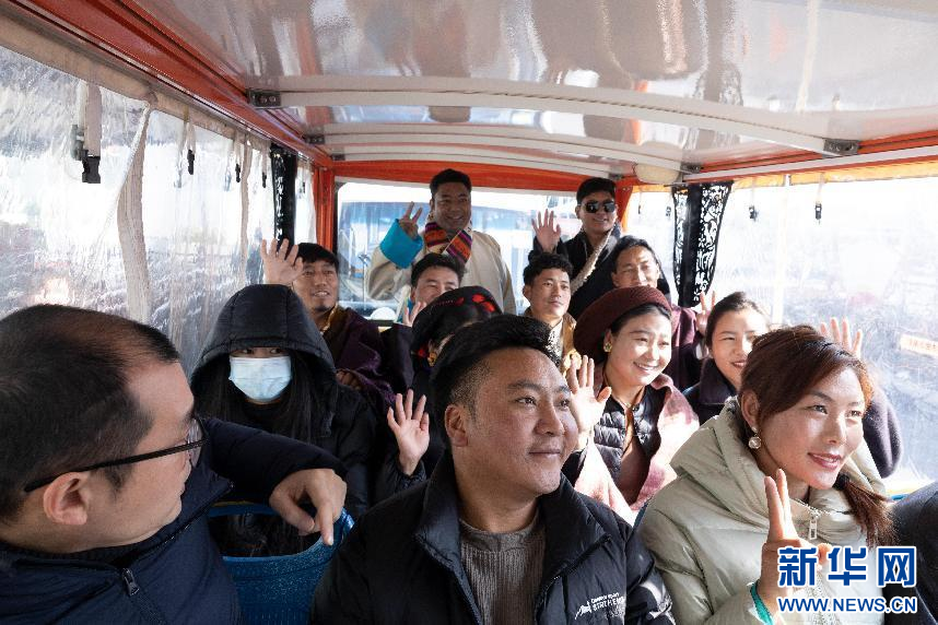 圖為墨竹工卡縣農(nóng)牧民帶表團(tuán)在南京高淳國際慢城景區(qū)觀光車內(nèi)合影留念(12月24日攝)。新華網(wǎng)發(fā) 李騰 攝