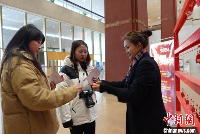 當(dāng)日上午,西藏博物館中央大廳聚集了許多參加現(xiàn)場(chǎng)活動(dòng)的游客。游客以隨機(jī)抽福袋、領(lǐng)獎(jiǎng)品的形式參與活動(dòng)。參與者紛紛表示在新年的第一天開展這樣的活動(dòng)很有意義。針對(duì)元旦期間來館參觀的游客,西藏博物館還制作有館藏文物元素的主題紀(jì)念賀卡供游客留念。