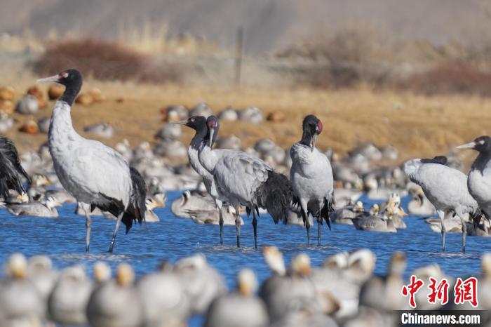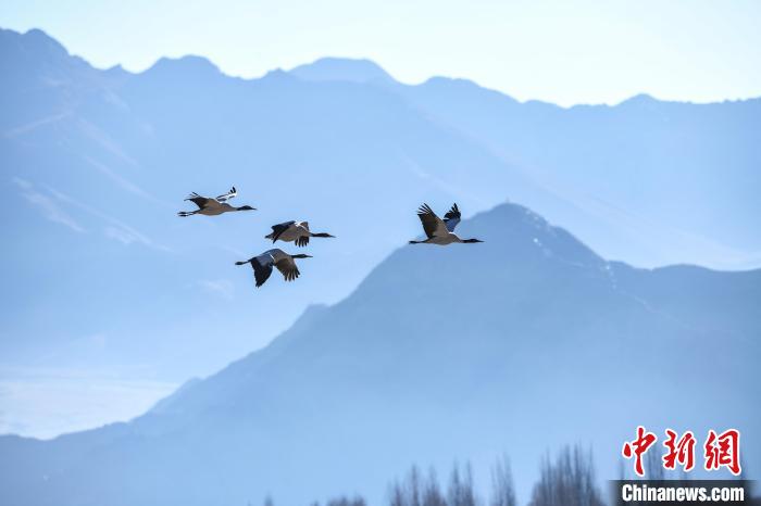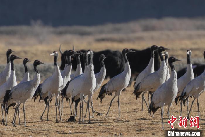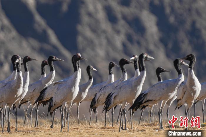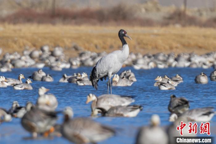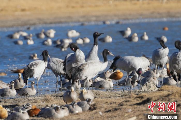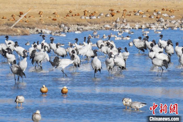 1月10日,西藏雅魯藏布江中游河谷黑頸鶴國家級自然保護區(qū)日喀則片區(qū)拉孜縣曲瑪鄉(xiāng)境內(nèi),大量越冬的黑頸鶴翩翩起舞,在濕地和農(nóng)田間覓食、嬉戲。近年來,隨著國家加大青藏高原生態(tài)保護力度,西藏多措并舉實施生態(tài)建設,廣大農(nóng)牧民民眾保護野生動物的意識不斷提升,黑頸鶴及其棲息地得到了較好的保護,黑頸鶴數(shù)量逐年遞增。據(jù)悉,每年11月至次年3月,日喀則市拉孜縣、謝通門縣、桑珠孜區(qū)等地都會有黑頸鶴在此棲息過冬,最高數(shù)量達到8000只左右。