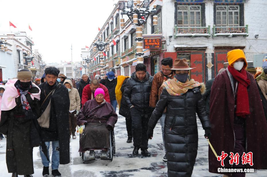 1月18日,西藏拉薩迎來一場大雪,雪后信眾在八廓街轉(zhuǎn)經(jīng)出行。布達(dá)拉宮銀裝素裹,分外美麗。圖為雪后信眾轉(zhuǎn)經(jīng)出行。