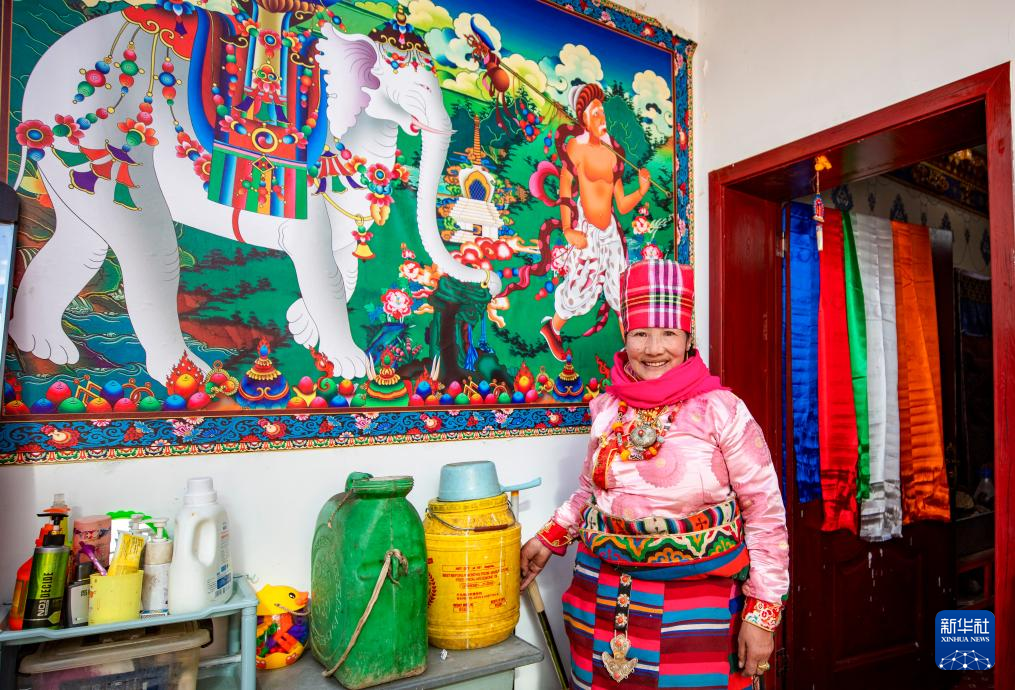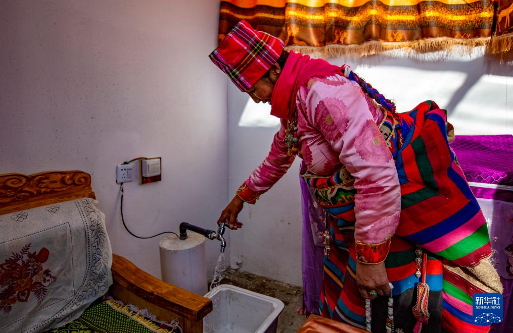 今年51歲的戶主格桑松塔說,以前冬天用水要去幾公里外的湖上鑿冰,后來要去幾百米外的機電井水房背水,自從2023年11月搬入新居,足不出戶就能用上水。他身旁,連接上水管的洗衣機正發(fā)出工作的轟隆聲。