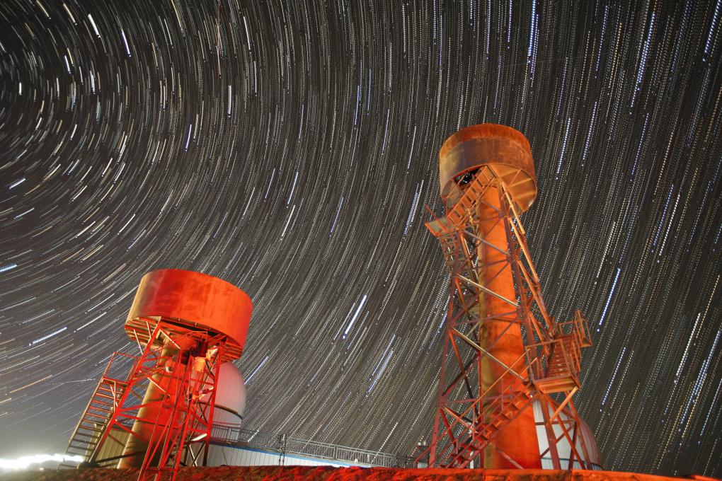 在拍攝天文臺(tái)星軌時(shí)也有一些有趣的瞬間:天已經(jīng)完全黑了,在相機(jī)取景器里并不能實(shí)時(shí)地看見天空、星星以及其他拍攝對(duì)象,這時(shí)候我們只能先長(zhǎng)曝光拍一張圖,結(jié)合已拍好的圖,根據(jù)自己的感覺慢慢調(diào)整構(gòu)圖,再進(jìn)行曝光拍攝。如此經(jīng)過三四次長(zhǎng)曝光拍攝以后,才能拍到自己想要的圖片。我的星軌照片就是這樣拍攝出來的。