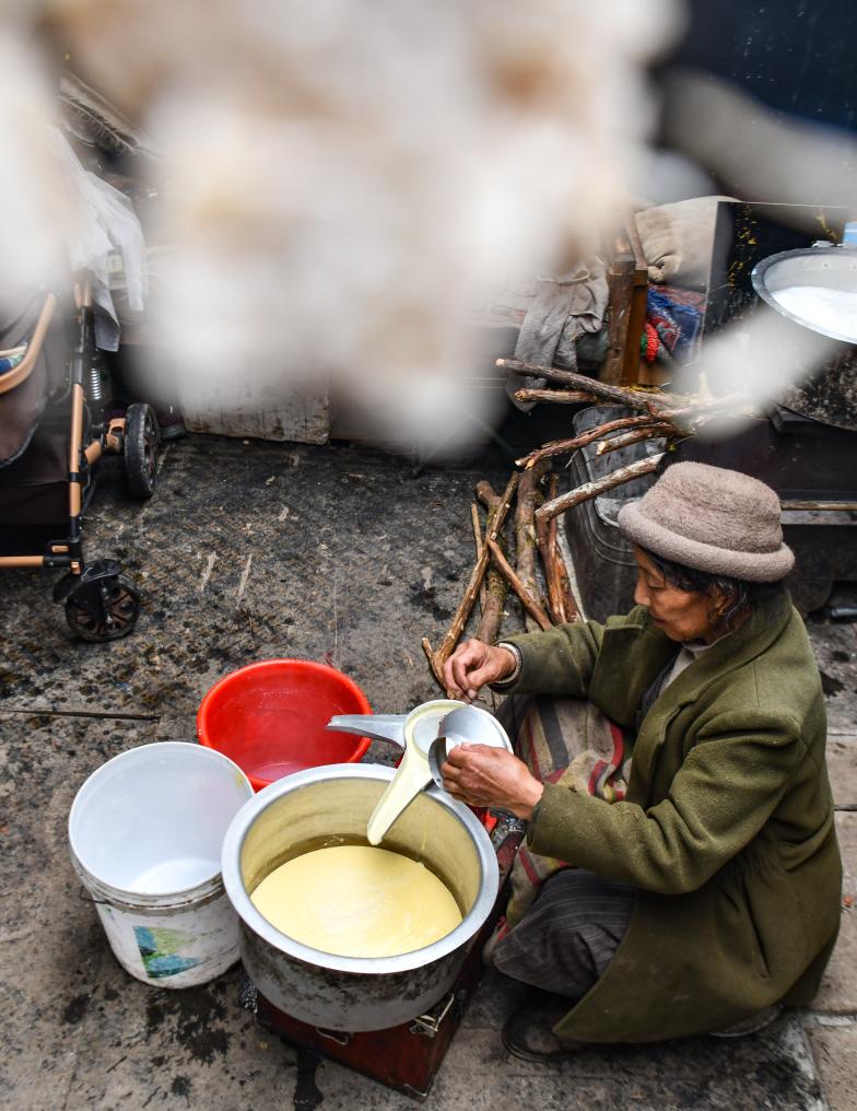 2023年6月10日,卓嘎在牧場(chǎng)的小屋里制作酥油。新華社記者 晉美多吉 攝