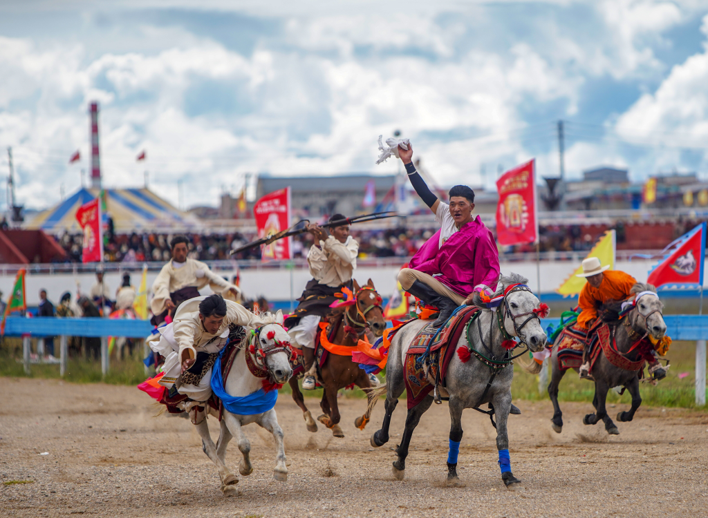 2023年8月10日,騎手在那曲市恰青賽馬節(jié)上進(jìn)行馬術(shù)表演。