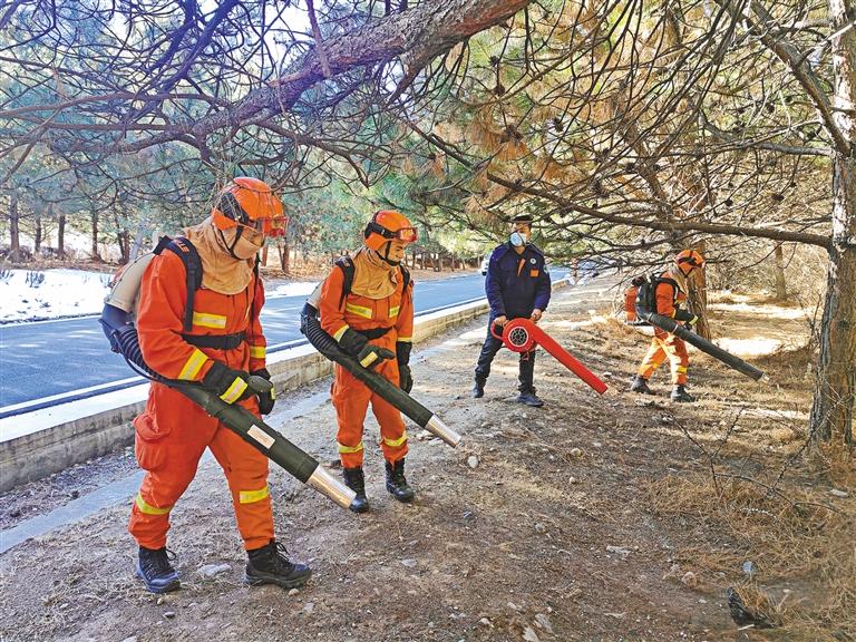 圖為森林消防員們?cè)诎秃渔?zhèn)周邊開展林下可燃物清理工作。記者 張猛 攝
