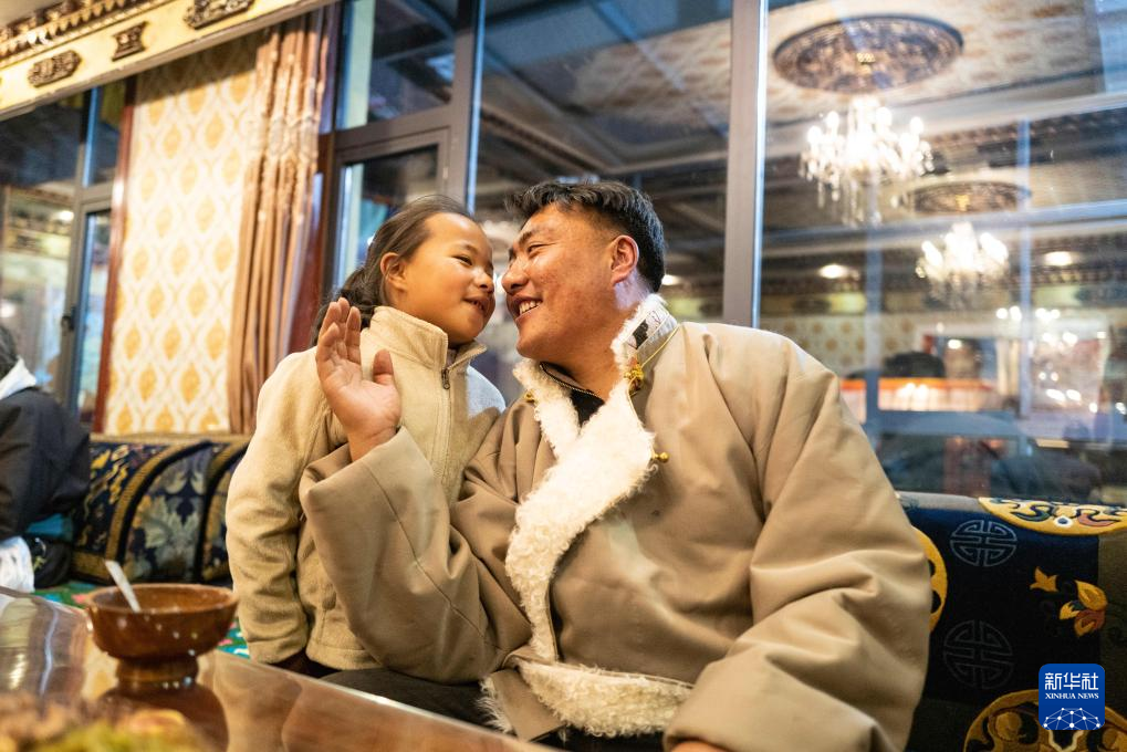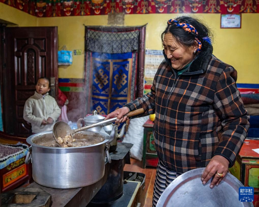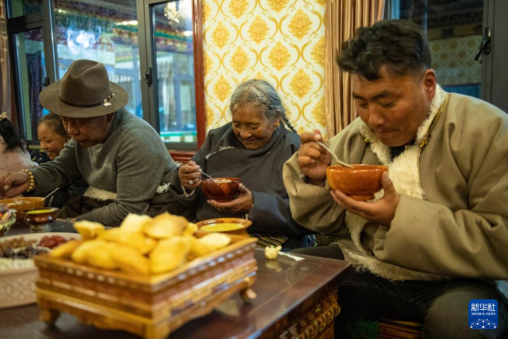 在西藏拉薩市當(dāng)雄縣公塘鄉(xiāng)甲根村,整個村子沉浸在節(jié)日氣氛中。村里的斯曲旺姆老人家四世同堂,房屋寬敞明亮。手里捧著盛滿“古突”的木碗,斯曲旺姆老人希望這樣的幸福能長長久久。