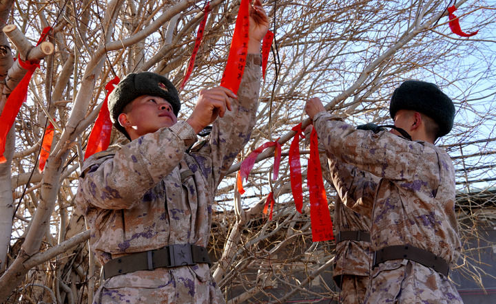 新春佳節(jié)來臨之際,阿里軍分區(qū)某邊防團扎西崗邊防連戰(zhàn)士在“先遣柳”前懸掛心愿布帶,寄語新年祝福(2024年1月17日攝)。新華社記者 陳尚才 攝