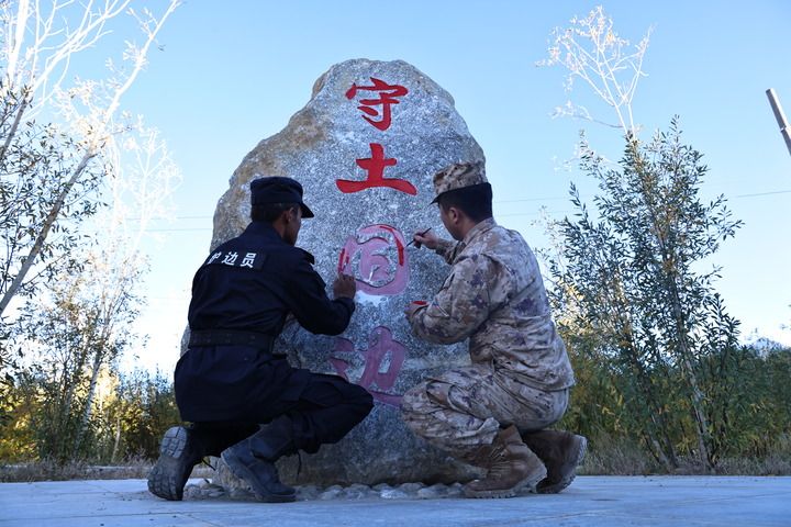 阿里軍分區(qū)某邊防團扎西崗邊防連戰(zhàn)士和移民管理警察共繪固邊石碑(2023年9月27日攝)。新華社發(fā)(李思鑫 攝)