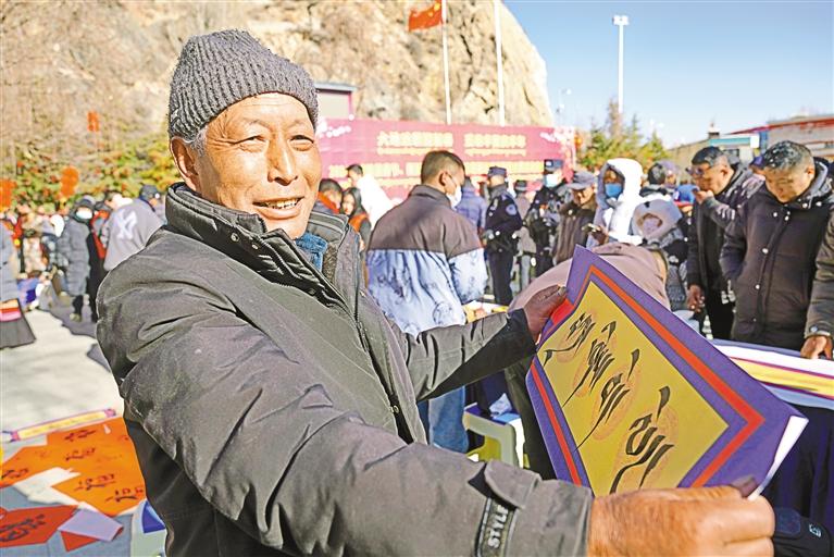 山南市文聯(lián)組織書法家走進瓊結(jié)縣,開展“我們的中國夢——文化進萬家”活動。圖為群眾展示獲贈的藏文書法作品。