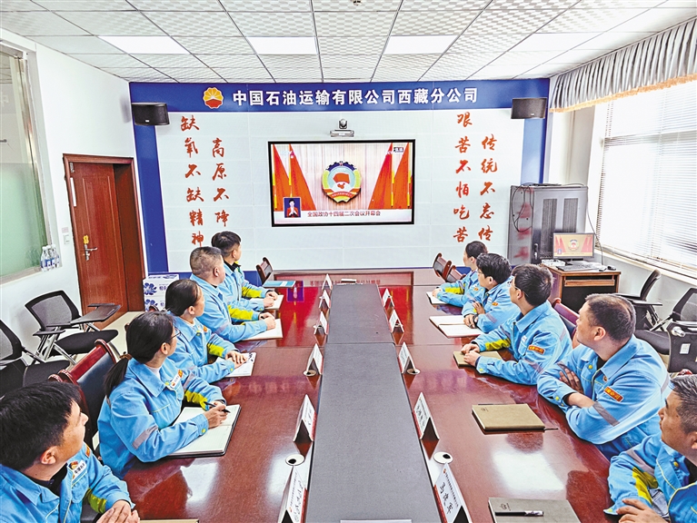 中國石油運(yùn)輸西藏分公司組織員工收看全國政協(xié)十四屆二次會議開幕會。格桑旦增 記者 次仁平措 攝
