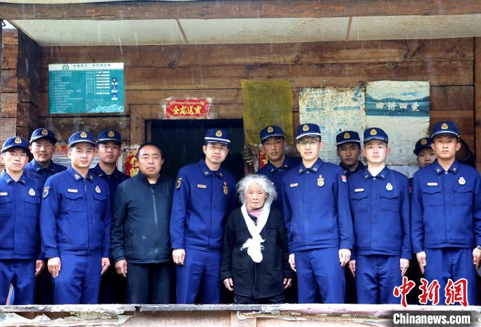 圖為消防救援人員與孤寡老人合影。吳蕾蕾攝