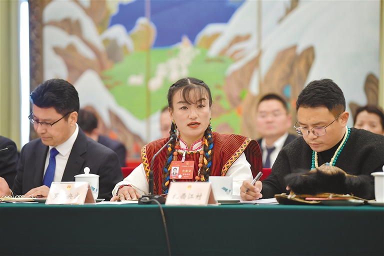 圖為3月6日上午,西藏代表團(tuán)舉行全體會議,傳達(dá)學(xué)習(xí)習(xí)近平總書記在參加江蘇代表團(tuán)審議時的重要講話精神,繼續(xù)審議政府工作報(bào)告,審查計(jì)劃報(bào)告和預(yù)算報(bào)告。圖為全國人大代表扎西尼瑪(中)在會上發(fā)言。