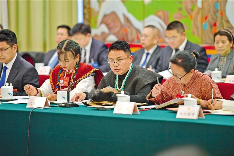 圖為西藏全國人大代表扎西江村(右)在西藏代表團全體會議上發(fā)言。旦增西旦 攝
