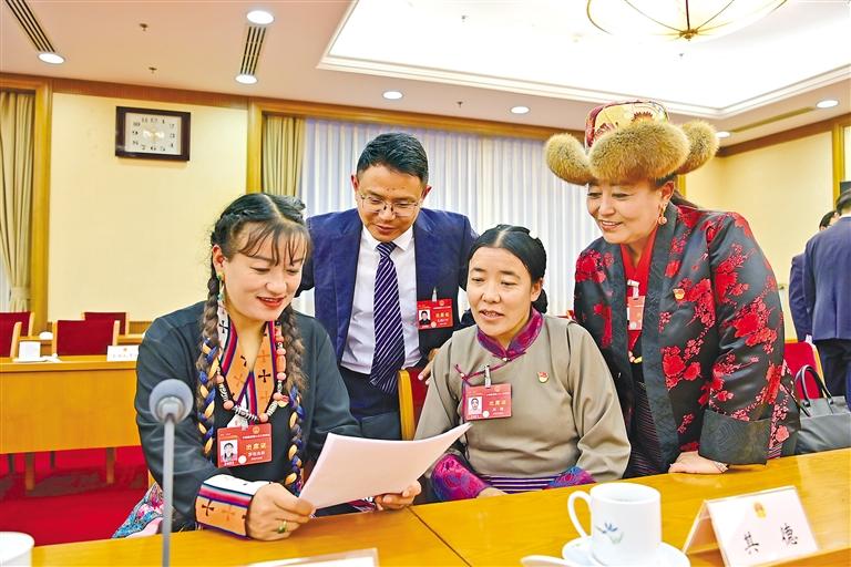 圖為西藏全國人大代表在會議間隙溝通交流。