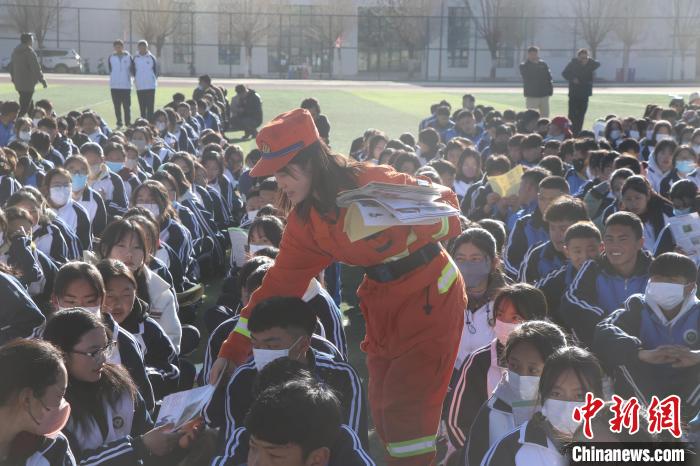 圖為消防員向?qū)W生發(fā)放防火宣傳單。徐靖 攝