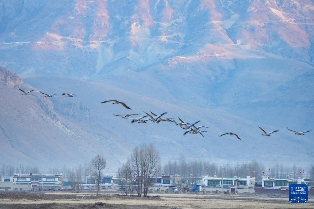 這是在林周縣虎頭山水庫(kù)附近村莊拍攝的黑頸鶴(3月17日攝)。新華社記者 晉美多吉 攝