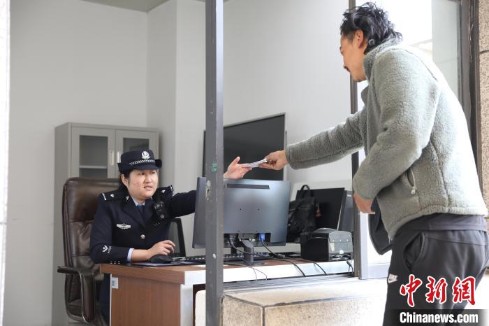 圖為吉隆口岸移民管理警察向通關(guān)貨車司乘人員辦理通關(guān)手續(xù)。肖富貴 攝