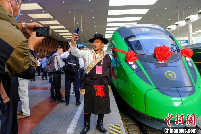資料圖為2021年6月25日,西藏拉林鐵路開(kāi)通運(yùn)營(yíng),拉薩曲水縣三有村村民次旦平措在復(fù)興號(hào)前拍照留念。江飛波 攝