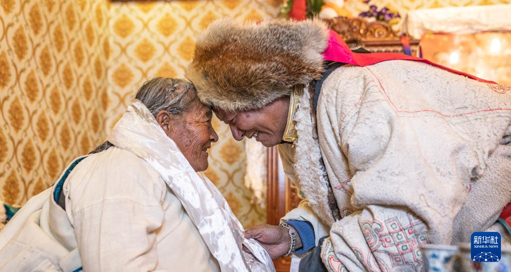 在位于拉薩市當(dāng)雄縣公塘鄉(xiāng)甲根村的家中,斯曲旺姆(左)和家人行碰頭禮(2月10日攝)。新華社記者 丁增尼達(dá) 攝