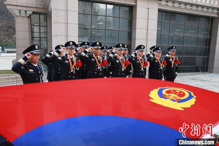 圖為榮獲戍邊紀(jì)念章的移民管理警察面向警旗進(jìn)行重溫入警誓詞。肖富貴 攝