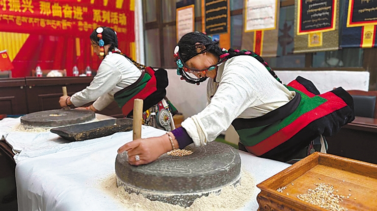 圖為在第三屆“鄉(xiāng)村振興 那曲奮進(jìn)”農(nóng)牧民技能大賽中,巴青縣農(nóng)牧民參賽選手進(jìn)行手工磨糌粑。記者 萬(wàn)靖 攝