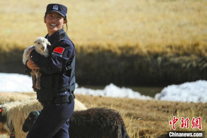 圖為日土邊境派出所民警抱著牧民的羊羔一起轉場。任博 攝