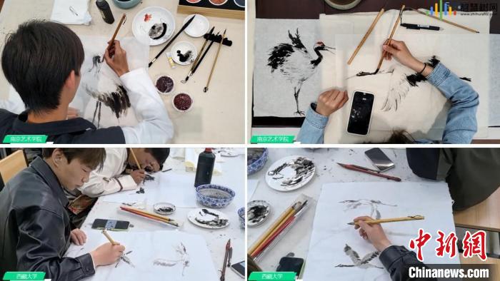 西藏大學(xué)藝術(shù)學(xué)院學(xué)生與南京藝術(shù)學(xué)院學(xué)生在線上共同繪制黑頸鶴。智慧樹平臺(tái)供圖
