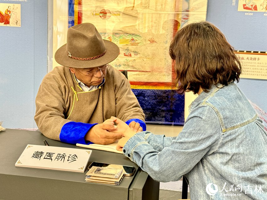 西藏自治區(qū)藏醫(yī)院藏醫(yī)主任醫(yī)師尼瑪為觀眾脈診、講解藏藥知識(shí)。人民網(wǎng)記者 李思玥 攝