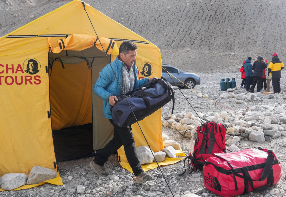 在珠峰登山大本營,哥哥多米尼克·德諾埃爾正在搬運(yùn)登山物資(5月18日攝)。新華社記者 丁汀 攝