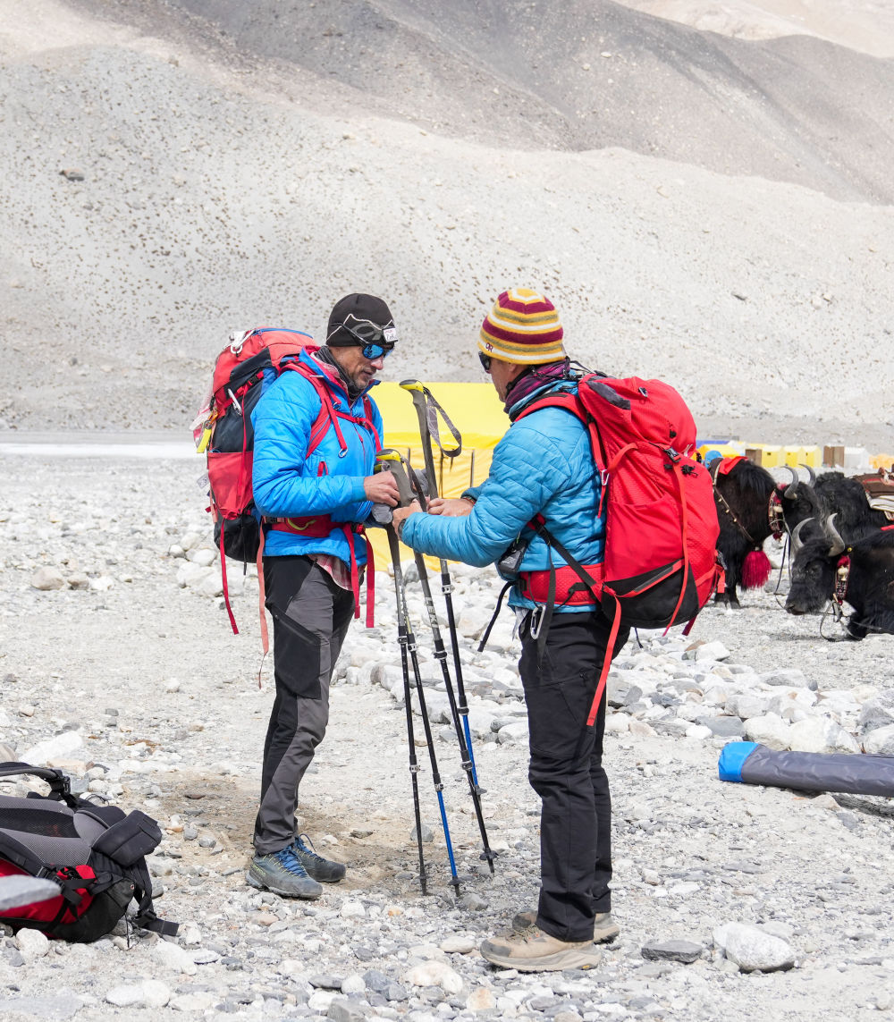 在珠峰登山大本營,弟弟帕斯卡爾·德諾埃爾(左)在和哥哥多米尼克·德諾埃爾互相檢查登山裝備(5月18日攝)。新華社記者 丁汀 攝