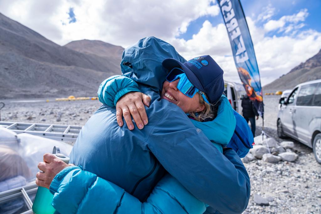 西芙·哈爾斯塔跟自己的高山向導擁抱(5月24日攝)。新華社記者 孫非 攝