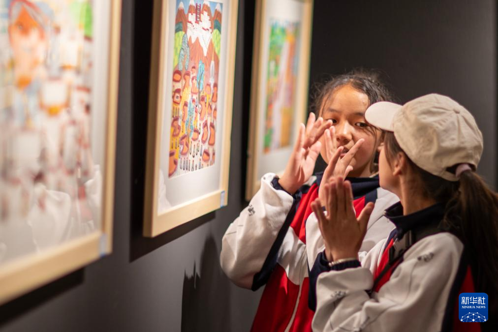 6月5日,拉薩市特殊教育學(xué)校的孩子在參觀作品展覽時(shí)用手語交流。新華社記者 姜帆 攝