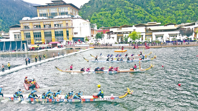6月10日,2024年西藏林芝南迦巴瓦高原體育大會魯朗中尼高原龍舟友誼賽精彩上演。來自尼泊爾、新加坡和北京市、云南省以及拉薩市、林芝市等多地的8支龍舟隊,百余名運動員奮力揮槳、激流勇進,為廣大群眾和游客獻上了一場水上競技的“大餐”。