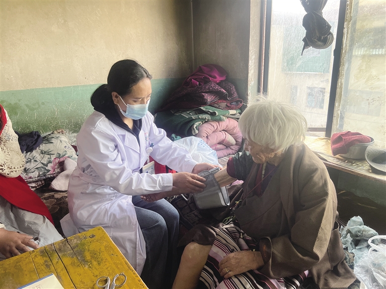 跟隨林聚社區(qū)黨支部書記扎西尼瑪?shù)哪_步,記者走進(jìn)一戶人家??蛷d中,一位頭發(fā)花白、身形佝僂的老人正側(cè)躺在沙發(fā)上閉目養(yǎng)神。老人名叫仁措,今年已經(jīng)94歲。看見扎西尼瑪?shù)絹?,兩人親切地拉起了家常。細(xì)心詢問老人的身體狀況后,扎西尼瑪和社區(qū)工作人員便開始為老人打掃房間。因老人行動不便,廁所有些污垢,工作人員仔細(xì)進(jìn)行了清理。隨后,工作人員將老人的臟衣服全部收集拿回社區(qū)清洗。見到老人精神有些不佳,扎西尼瑪叫來社區(qū)的衛(wèi)生服務(wù)隊(duì)為老人檢查身體。