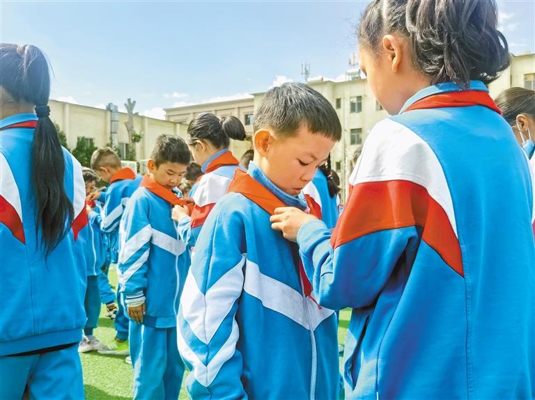 圖為少先隊員代表為新隊員佩戴紅領(lǐng)巾。記者 次仁平措 通訊員 胡舟 攝