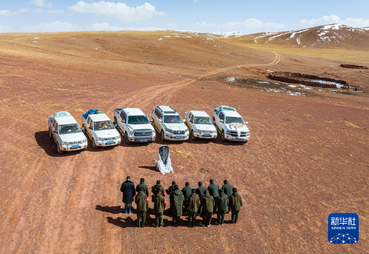 野生動物專業(yè)管護隊員們在無人區(qū)深處的羅布玉杰烈士紀(jì)念碑前默哀致敬(無人機照片,5月10日攝)。 新華社記者 姜帆 攝