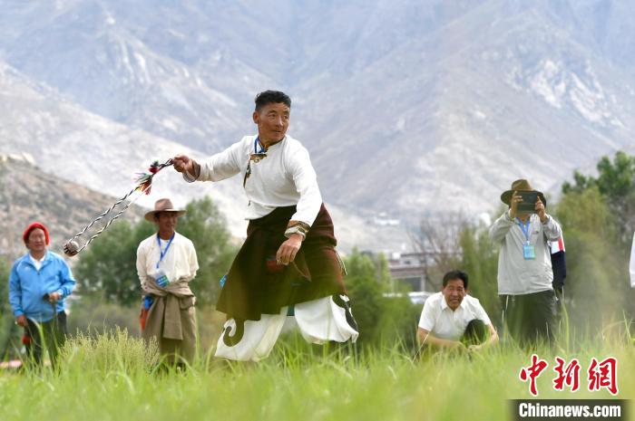 古朵指的是用牦牛毛或者山羊毛編織成的拋石繩,可以將石頭投擲到較遠(yuǎn)的地方,是牧民們用來放牧的工具。圖為6月23日拉薩首屆農(nóng)牧民運(yùn)動會上,參賽選手正進(jìn)行古朵比賽。中新社記者 李林 攝