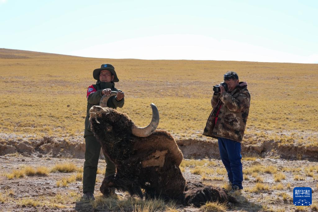 6月13日,羌塘國家級自然保護區(qū)野生動物專業(yè)管護隊員在檢查一頭野牦牛的尸體。新華社記者 旦增尼瑪曲珠 攝