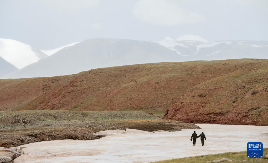 6月15日,羌塘國家級自然保護區(qū)野生動物專業(yè)管護隊員索朗(左)和羅布檢查河面冰凍情況。新華社記者 晉美多吉 攝